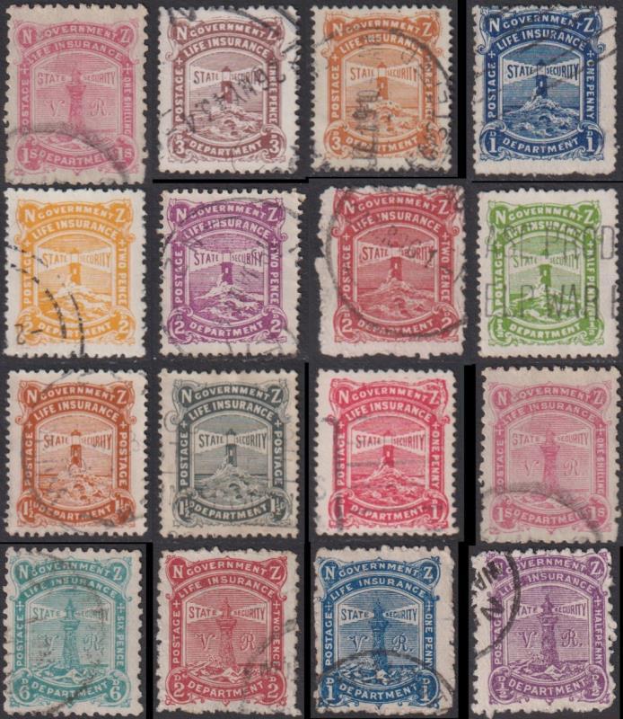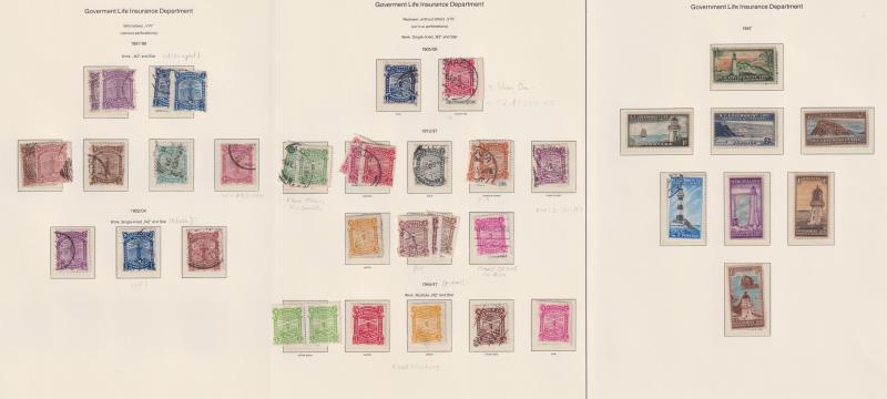 1891-1981 comprehensive colln of MUH/mint & used on 25 Hagner pages with 1891 3d x 4, 6d x 4 & 1/- x 2 (both with minor flaws) all FU; 1905 1d blue x 5 (incl horiz pair), 1d red with invtd wmk, 2d chestnut x 4, all GU/FU; & 1½d black, 2d purple, 3d yellow-brown & 6d pink (p14) all MUH. Also incl JW Brodie 1988 "History of Government Life Postage Stamps" publication. (Image)
