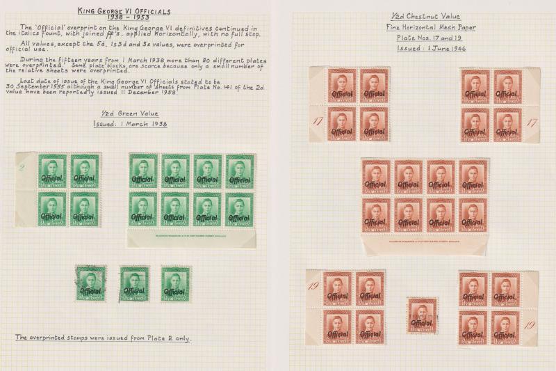 1938-53 GVI specialised mint/MUH on annotated pages. Good range all values with plate blocks, papers, shades, a few retouches etc. Noted: ½d green imprint block; ½d chestnut pl 17 & 19 each both positions, imprint block, pl 101 & 111; 1d red pl 6 & 7 both positions & pl 4, imprint block; 1d green pl 29 (very light gum tone), plus 24 other PBs; 1½d choc pl 21 both positions (1 minor tone) & imprint block; 1½d scarlet all 5 PBs; 2d 16 PBs; 3d x 10 PBs incl pl 39, 138 & 139 fine paper; 4d x 3 PBs; 6d x 3 PBs; 8d x all 3 PBs; 9d PB 97; 1/- all 4 PBs; 2/- x both PBs. All stamps in mounts & some items MUH. Also a few used examples. Huge cv. (Image)
