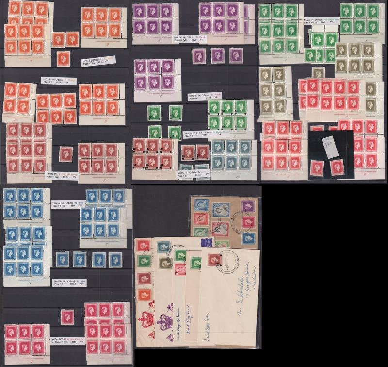 1954-63 QEII seln incl complete series of 17 plate blocks of 6 (from 1d to 3/- & provisional ovpts), 3d with invtd wmk FU x 2 & 6 FDCs incl 1/3/54 addressed cover (with 7 official values as well as 15 QEII values to 10/-) & 1/3/63 addressed illustrated FDC with 2½d & 3/-. CP cat $2500+. (Image)