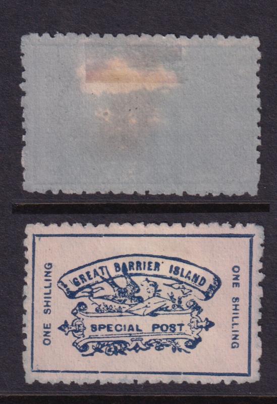 1898 1/- Great Barrier Isl Special Post blue on white, bluish rear. Jury cat $350. MNG. (Image)