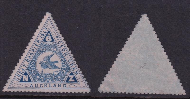 1899 6d Great Barrier Isl blue triangular, blued paper. Cat $150. MNG. (Image)