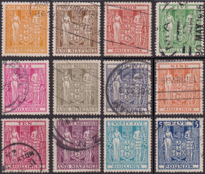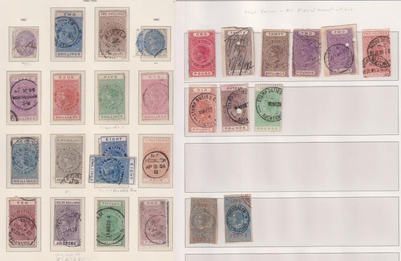 1882-1930 2/- to £1. Noted: 2/-, 3/- (WT perfin), 6/-, 7/- (registered cds), 8/-, 9/-, 10/- (telegraph cds), & 15/- postally used. Also, several fiscals, incl 2 x 1d 1867 imperfs (29v). Cat simplified $1495. (Image)