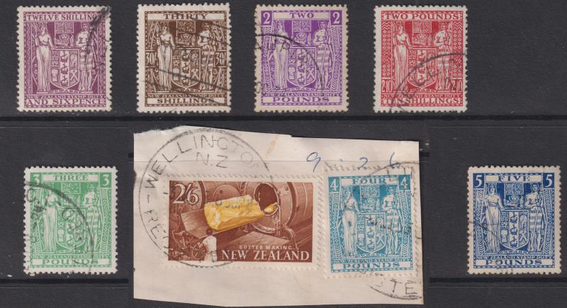 1931-56 seln of 7: 12/6d, 30/-, £2, £2.10 (one short perf), £3, £4 (on piece) & £5. Jury cat $3240. FU. (Image)