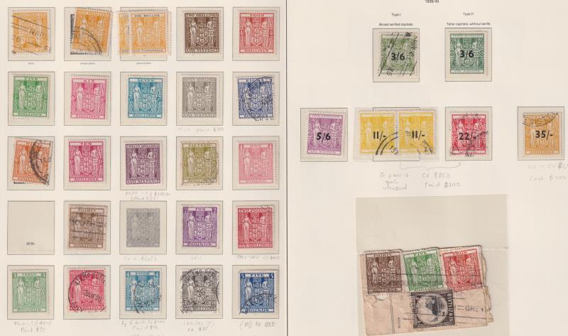 1931-67 1/3d - £5 mint/MUH/used on hingeless pages. Noted: 12/6d MUH, £2/10/- CTO, £4 & £5 used, 35/- on 35/- part registered cds. Also, odd fiscal. 60v. Cat simplified $5200 approx. (Image)