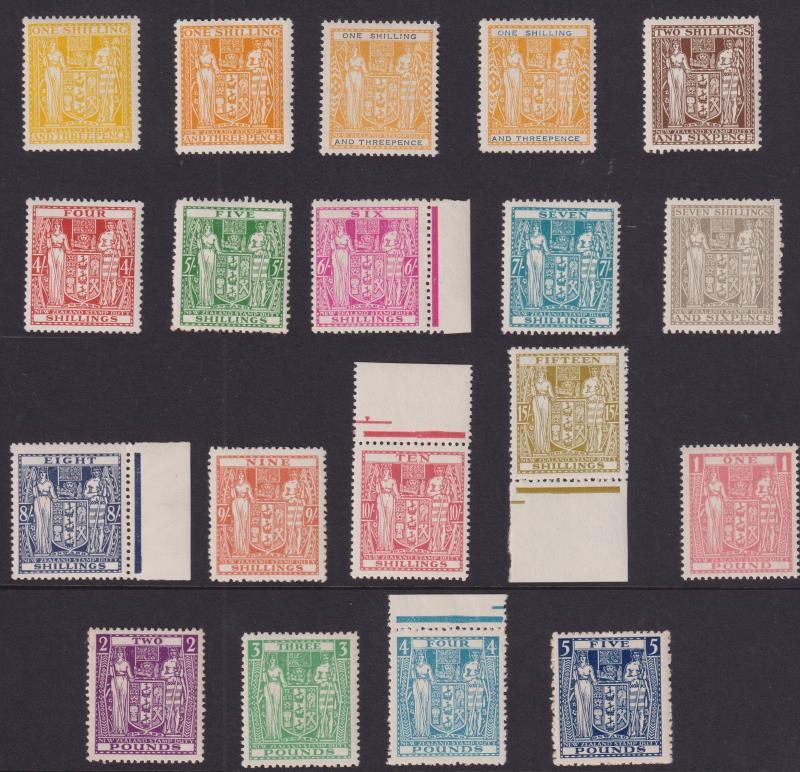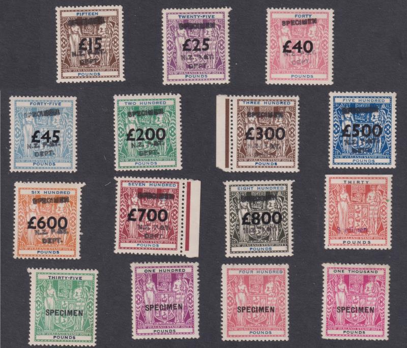 c1931 "Specimen" ovpts: £30, £35, £100, £400, £1000 "SPECIMEN" & NZ P & T./DEPT" surcharged ovpts: £15, £25, £40, £45, £200, £300, £500, £600, £700 & £800. All on Cowan paper. All MUH (£30 mint) & £600 gum tone spot. A truly remarkable believed assemblage, most items unique. Listed Kiwi cat appendix III, type 7. (Image)