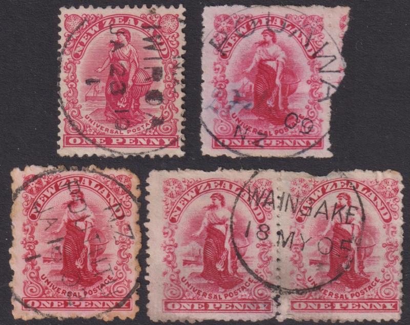 Gisborne postal district: 4 diff very scarce to rare pmks on 1d Universals: Iwiroa “A” class (Wooders rated 8/10); Pouawa “B” (9/10); Poututu “A” (9/10) & Waingake “A” (8/10). All good-fine near complete strikes. (Image)