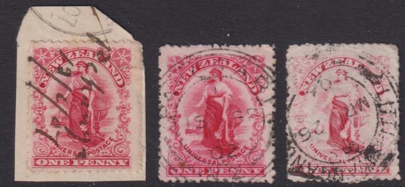 Greymouth & Westport postal districts: 3 rare pmks on 1d Universals: fine “Pekanga 12/6/07” manuscript cancel [GM, P.O. open only 1907-1912, “G” class cds proofed c1908 but no examples seen]. This is THE sole m/s cancel recorded. Also, good Pakorari “H” class (Wooders rated 8/10) 15 SP 02 (GM, 1901-12) & Little Wanganui “H” (10/10) MR 26 04 (WP, 1895-1919, “H” replaced by “J” in 1911). (Image)