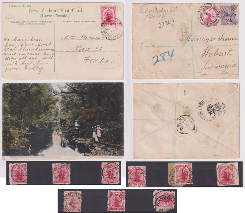 Hamilton postal district: range of 9 diff very scarce to scarce pmks on 1d Universals: Kakepuku “A” class (Wooders rated 8/10); Kiritehere “F” (9/10, known 1908-1911 only); Oparure “A” (9/10); Patunga “J” (8/10); Rukuhia “H” (10/10); Tahunga “A” (9/10); Te Rapa “H”; Waerengahou “G” (10/10); Wardville “B” (9/10). All good-fine near complete strikes. Also, fine strikes of Rotoorangi “H” (10/10) OC 4 07 on fine PPC & Tangawahia “H” (8/10) 11 SP 03 (muddled date – month invtd) on spiked “Tatts” lottery cover to Hobart. Rare lot. (Image)