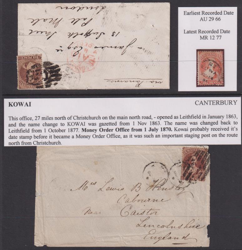 Kowai (CH 1863-77, to Leithfield) good-fine complete A-class cds OC 4 67 on fine cover to GB (heavy "C" obliterator on 6d FFQ Chalon & fine Christchurch early machine d/s on back). Also poor strike on similar cover to GB & fine A SP 14 69 on 1d FFQ Chalon (3 items). (Image)