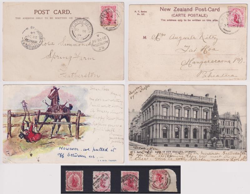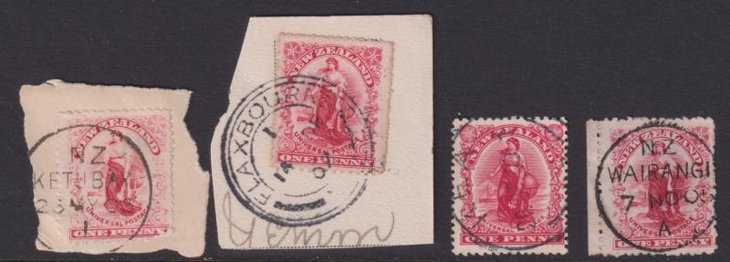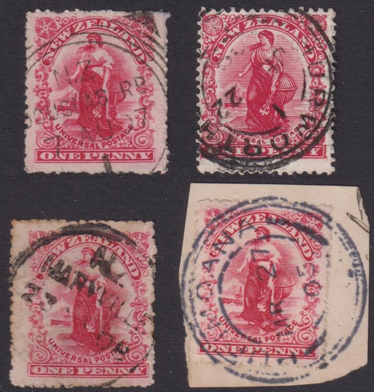 New Plymouth postal district: 4 diff very rare to rare pmks on 1d Universals: Douglas Road “F” class (Wooders rated 9/10); Hurimoana “H” (8/10); Hurworth “H” (9/10) & Maryville “A” (8/10). All good-fine, near complete strikes. (Image)