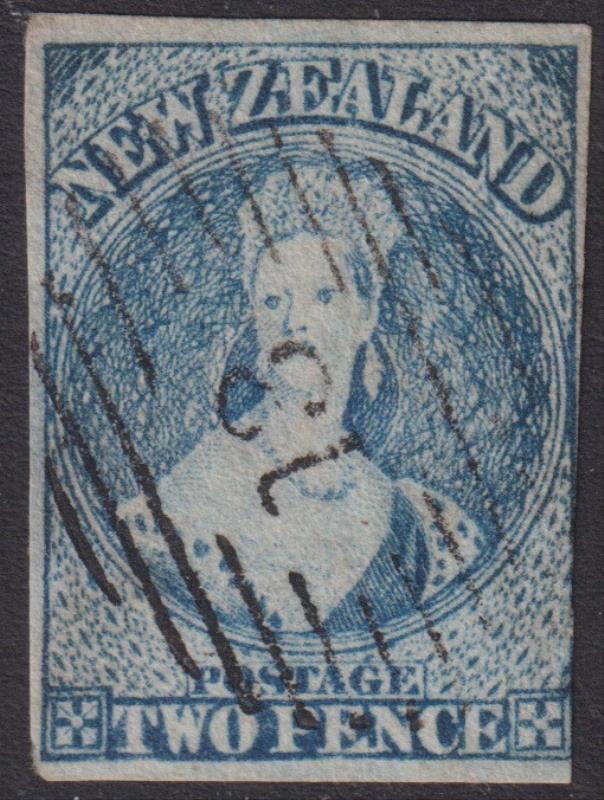 Middle Rangitikei/Rangitikei (PM 1861-72, to Bulls) Perkins Bacon supplied 1855 series barred obliterator "13". Use at Rangitikei (c1864 on) postulated by KJ McNaught (1988). Very fine complete strike (c1864-65?) on 2d blue FFQ Chalon SG 39 (plate 1, worn state, star wmk, imperf), 3½ margins. Appears very early use (sharp clear impression). Very few definite examples are known (& none at all on cover, which would normally enable attribution). Rare. (Image)