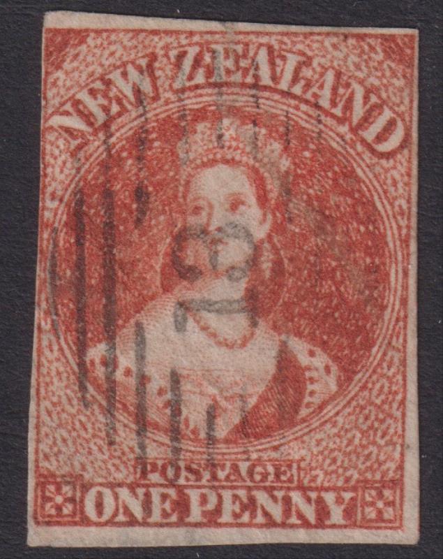Middle Rangitikei/Rangitikei (PM 1861-72, to Bulls) fine barred "13" cancel on 1d carmine-vermilion FFQ Chalon SG 35 (imperf 3 margins, star wmk, minor creases). FU. Ditto comments on previous lot. (Image)