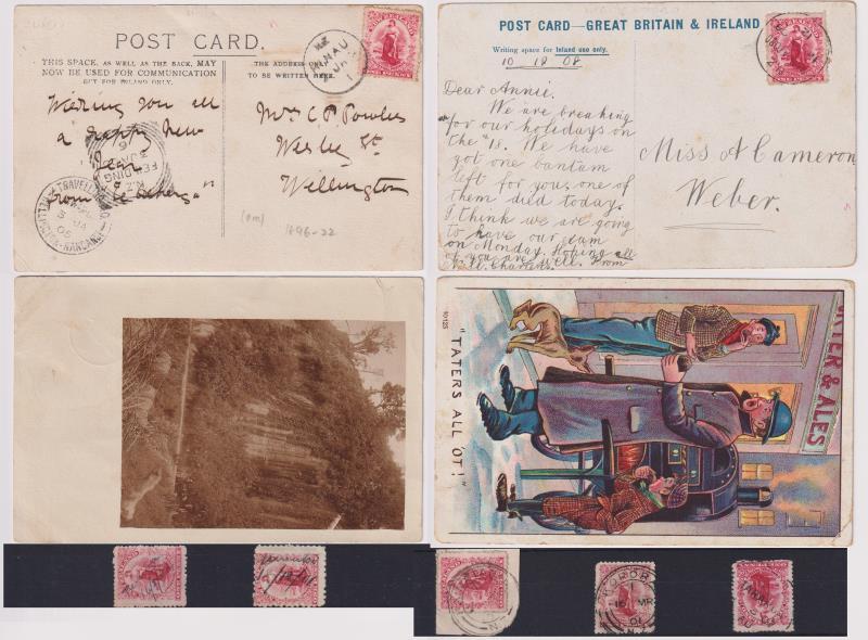 Masterton postal district: 4 diff very scarce to rare pmks on 1d Universals: Mount Bruce “H” class (Wooders rated 8/10); Stronvar “A” (7/10); Waihoki Valley “H” (9/10) & Waingawa “H” (7/10). Also, fine strike of Saunders Road “H” (10/10) & good/fine strike of Te Wharau “H” (7/10) – both on 1d Universals on fine PPCs. All complete or near complete strikes. Rare lot (6 items). (Image)