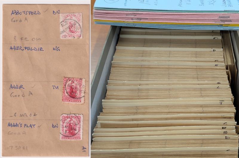 Postmarks on 1d Universals (1901-1909) colln/accum arranged alphabetically in approx 600 small non-transparent manila wages packets, in shoebox. Wide range of approx 2000 mostly different, on stamp or piece, POs identified on front of packets (up to 4 diff per packet). From common to rare cancels. Variable quality of strikes, from partial to complete, patchy to clear impressions. Some good items throughout. In addition, are 14 circuit books of priced remainders, but nothing expensive noted, various post office cancels on a range of stamps from SSF (many on 1d Universals) through to c1950. Weight 1.94kg. (Image)