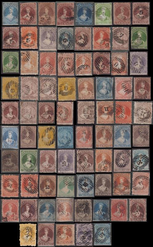 From 1855 Perkins Bacon 11 barred obliterators no's 1 - 18 (each issued x 2). Colln of 80 FFQ Chalon stamps, written up (1 per page!) on well illustrated pages. Noted: "1" x 2, "2" (1), "3" (4), "5" (7), "7" (4), "8" (10), "9" (8), "11" (5), "12" (2), "13" (1), "14" (3), "15" (9), "16" (4), "17" (8), "18" (11). Strikes mostly full & clear, with places of use identified. The rare "13" (believed used at Rangitikei) is on 4d yellow SG 120 (issued 1866). Other stamps stated to incl 2d SG 9 (cat £180) x 2, 6d SG 13, 14 (£350 ea), 1/- SG 16 (£1900, small back thin), 2d SG 37 (£300), 3d SG 40 (£225) x 3, 1/- SG 45 (£500) x 2, 6d SG 85 (£350) x 2, 1/- SG 100 (£475) x 2, 4d SG 120 (£200) x 2, 1d SG 137 (£400). Some recent oxidation throughout. 11 stamps with Odenweller certs (c2015). (Image)