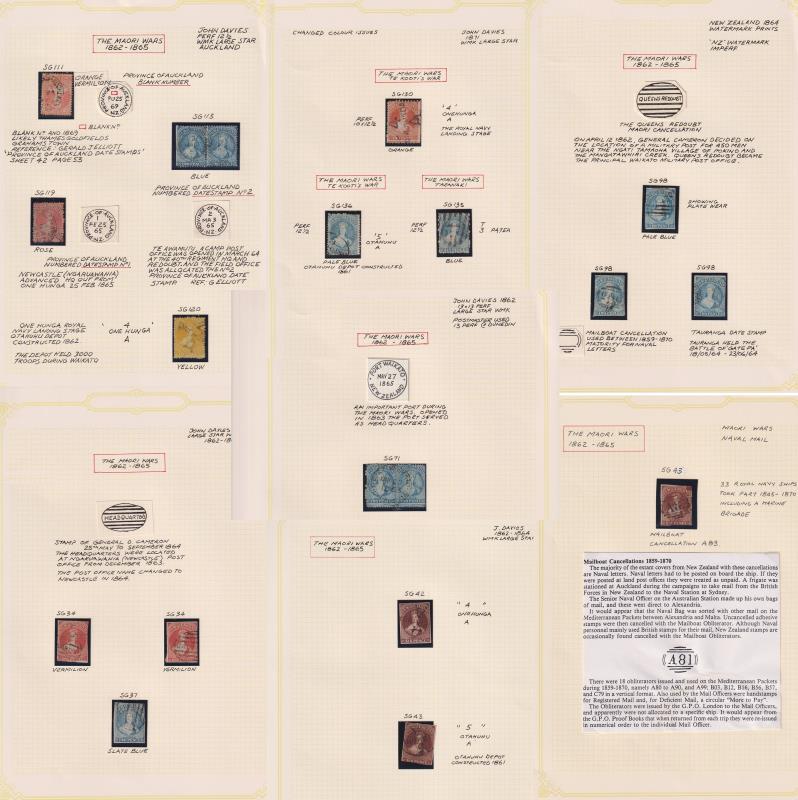 c1860s Land Wars cancel on FFQs Chalon: "Province of Auckland" cdss x 3 - blank 1 & "2"; "4 Onehunga A" x 3; 5 Otahuhu (A) x 2 (1 only small part); "T/3" (Patea); "Port Waikato"; "Queen(s) Redoubt" (very indistinct); Mail Boat cancel x 2; (very small part) Tauranga cds; Headquarters x 3 (all part only). A total of 17 cancels (19 stamps). On 7 nicely written up pages. (Image)