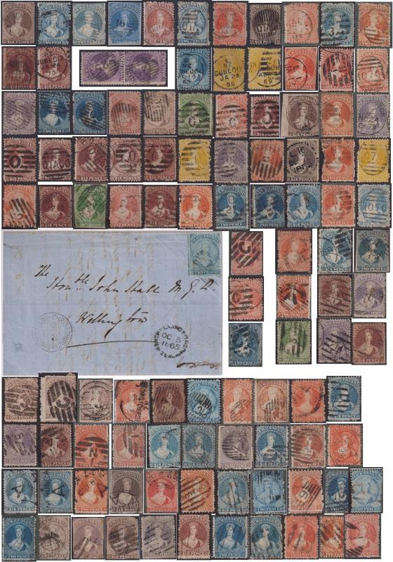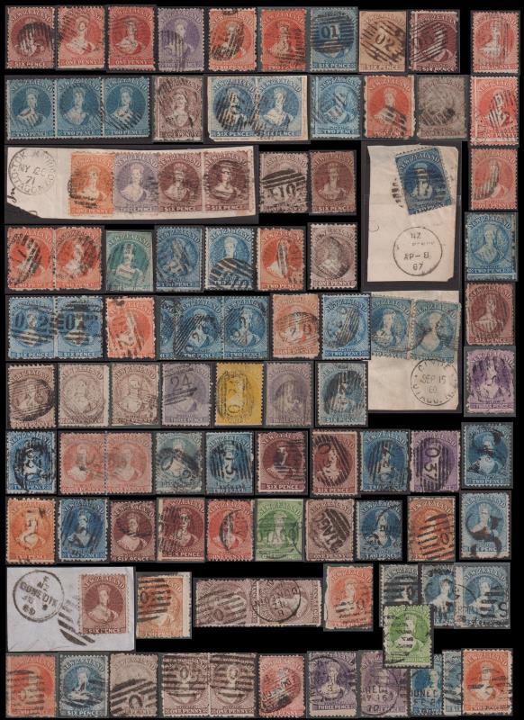 1860s-70s misc early pmks on FFQ Chalon stamps (79, & 1865 cover to Sir John Hall with fine early Christchurch "Wright" machine d/s SE 29 65). Written up (1 item per well-illustrated page) in fine Davo L/L album (with slipcase). Scarce items noted incl "7" of Havelock, "3" of Waipawa, Canterbury L1, L7, L16 cds (all rear), "N/5" of Charleston, "N/4" of Hope, "4/ONEHUNGA/A" (4), "a" m/s of Ahaura, "H/1" of Napier (5), many "C" obliterators of Christchurch & "1" of Auckland, & various other obliterator or manuscript pmks. Strikes vary in clarity/completeness. Stamps stated to include 1d SG 33 (cat £350), 3d SG 60 (£225), 6d SG 41 (£200), 1d SG 69 (£450), 2d SG 118 (£120), 1/- SG 125 (£160). A few other higher cv items have faults. Also 32 misc extra pmks on FFQs (incl nice pair 3d SG 118) on 2 Hagner pages. 3 with Odenweller certs (2015-6). (Image)