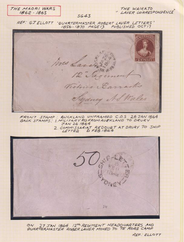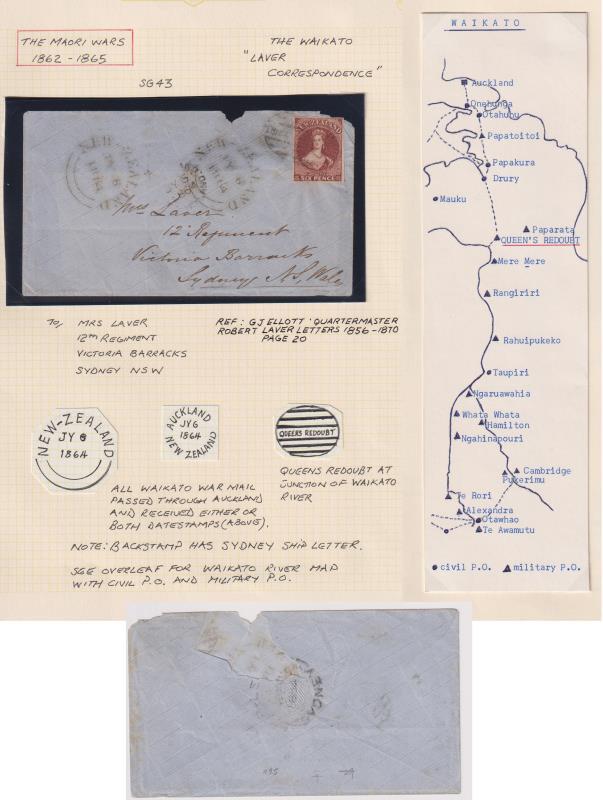 1864 Land Wars "LAVER" cover, sent by Robert Laver to Sydney, 6d red-brown FFQ Chalon (SG 43) tied by indistinct framed cds, also unframed Auckland JA 26 1864 cds. B/s indistinct Drury JAN 26 cds & Ship Letter Feb 11 cds. Nicely written up on page. (Image)