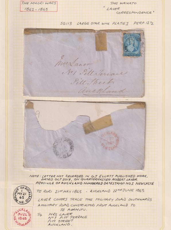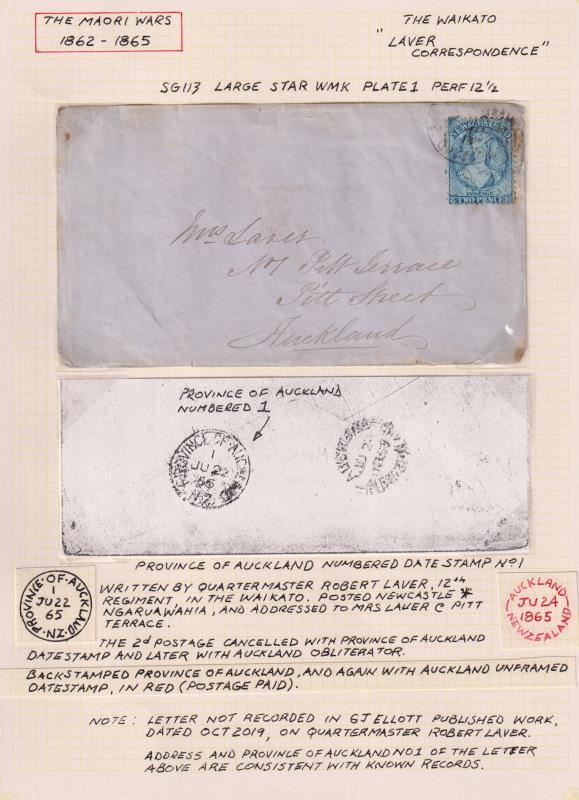 1865 Land Wars "LAVER" cover, written by Robert Laver to Mrs Laver, Auckland, 2d FFQ Chalon blue p12½ (worn plate), tied by rather indistinct "Province of Auckland 1 JU 21 65" cds. B/s Province of Auckland 1 JU 21 65 cds & Auckland JU 22 65 cds. Flap missing & sellotape repairs (note: vendor states pmk is MY 21 but very indistinct). Nicely written up on page which states cover not recorded by Ellott. (Image)
