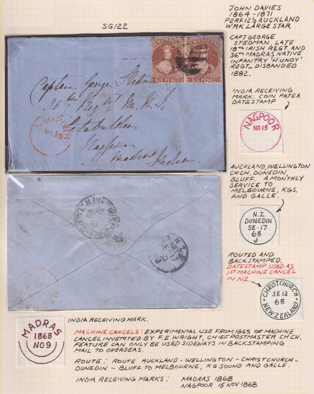 1868 cover sent to India with 6d FFQ Chalon pair (red-brown p12½ SG 122), tied by indistinct barred & cds cancels (maybe local Canterbury origin). Also on front, Nagroor NO 19 cds in red. B/s Christchurch SE 12, Dunedin SE 17 & Madras No 9 cdss. On well annotated page. (Image)