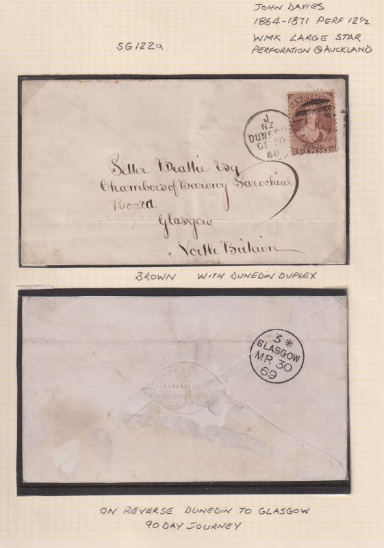 1868 cover Dunedin-Glasgow with 6d FFQ Chalon brown (SG 122a) tied by Dunedin DE 30 duplex. B/s Glasgow MR 30 69. A 90 day journey! On annotated page. (Image)