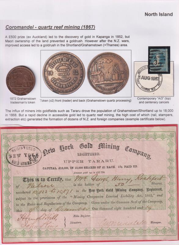 1869 Coromandel goldmining exhibit page with a "New York Gold Mining Co" share certificate (1869) in fine cond (scarce); an 1872 Grahamstown tradesman's token featuring a quartz extraction mill & 2d blue FFQ Chalon (SG 115) cancelled with an A/3 duplex (Thames). Grahamstown and Shortland joined to become Thames around 1870. (Image)
