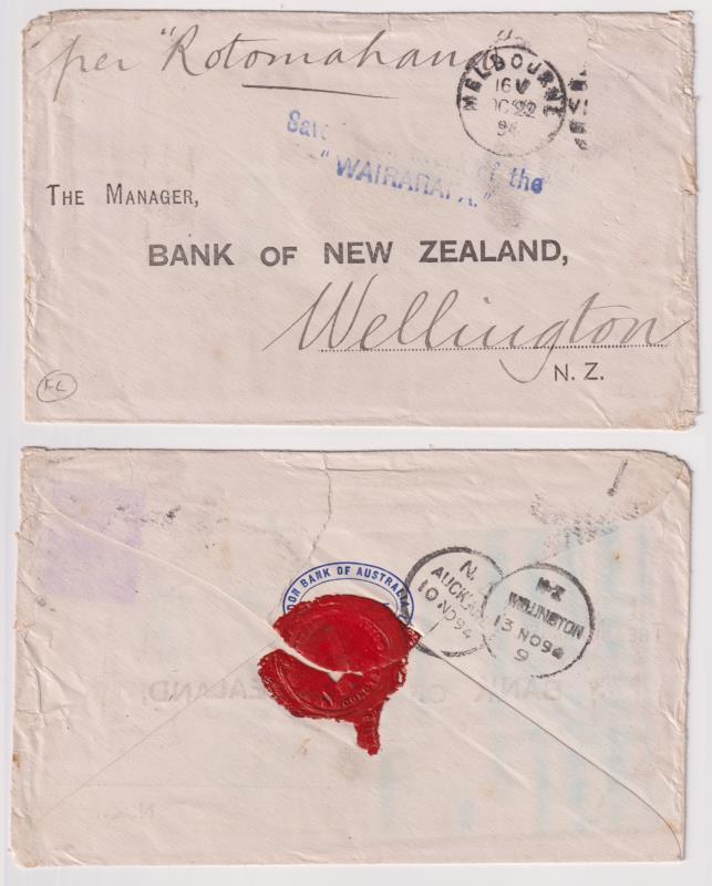 1894 "SS Wairarapa" wreck cover. "SAVED FROM THE WRECK OF THE / WAIRARAPA" s/l cachet (slightly indistinct) on envelope sent to BNZ Wellington. Stamp floated off, Melbourne 22 OC duplex cancel. Sent from London Bank of Australia. B/s wax seal Auckland 10 NO & Wellington 13 NO "A" class cdss. (Image)