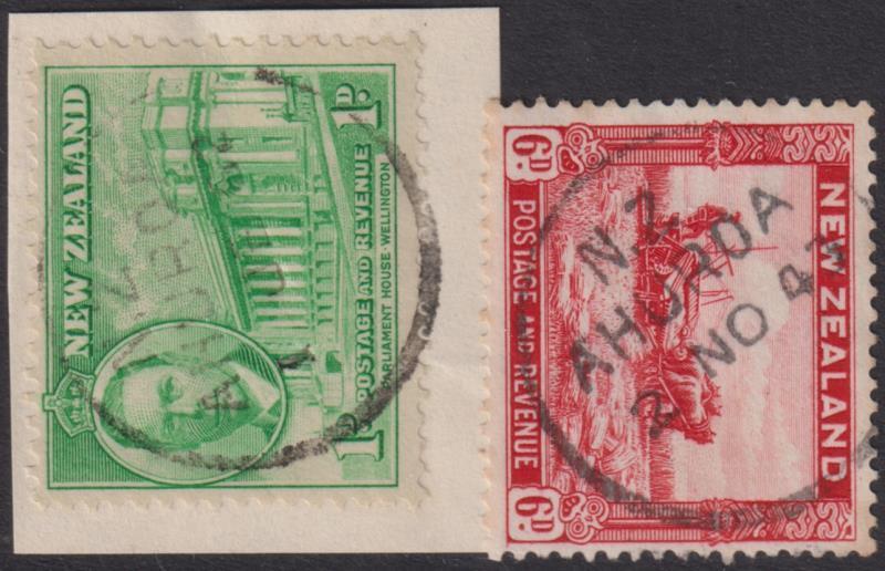 Ahuroa (AK 1902-76) fine almost complete A-type cds 2 NO 43 on 4d Harvesting, & complete but very light strike 1 JE 47? on 1d Peace (2). (Image)
