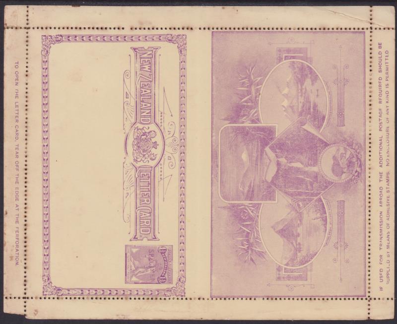 1895 1½d QV violet on yellowish cream lettercard, Rotary p10, indicia ovpt "SPECIMEN", minor blemishes. Samuel BA4a var. (Image)