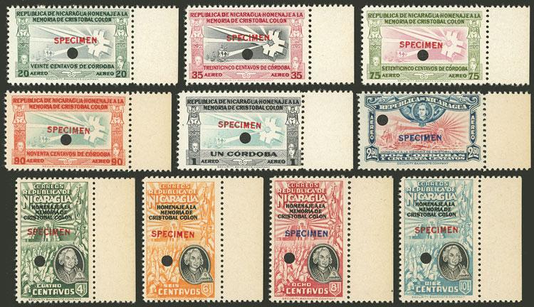 Yvert 709/712 + A.237/242, 1945 Colombus, the set of 10 values overprinted SPECIMEN and with punch hole, MNH, excellent quality, rare! (Image)