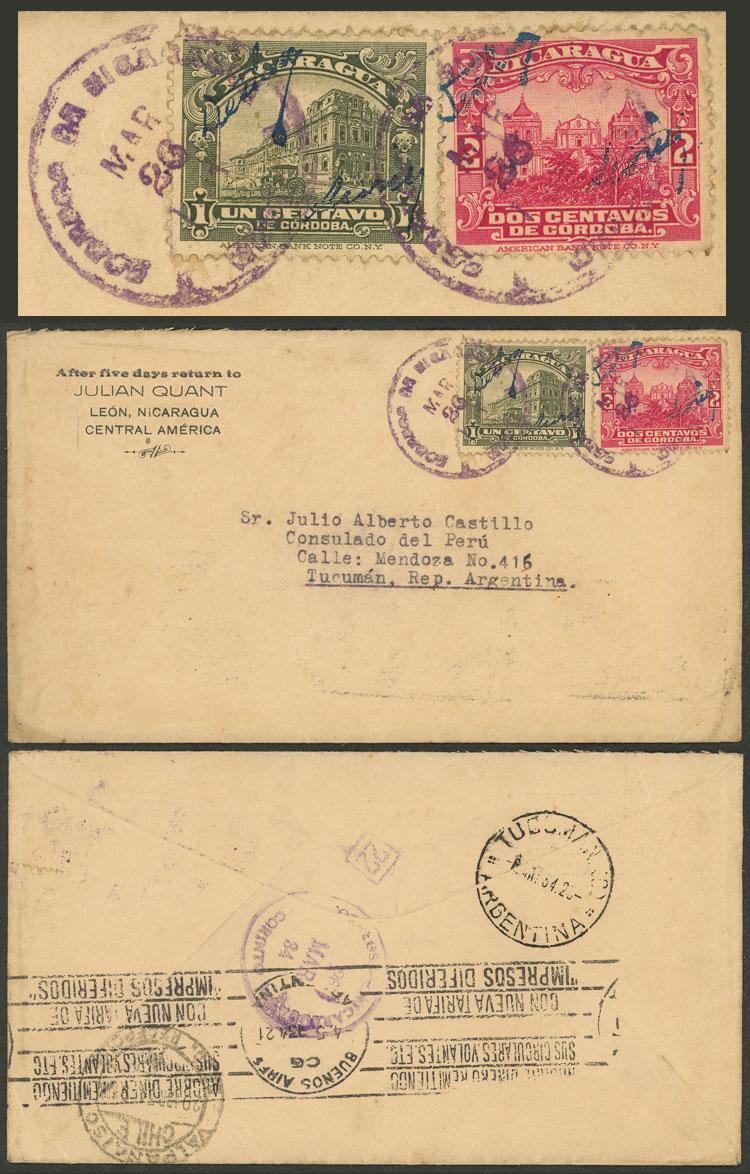 26/MAR/1934 León to Argentina, cover franked with stamps of 1c. and 2c. (total 3c.) with printed control marks, on back there are transit marks of Corinto, Valparaiso and Buenos Aires, and Tucumán arrival of 6/MAY!, VF! (Image)