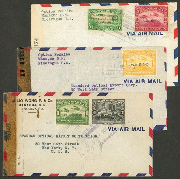 3 Airmail covers sent from Managua to USA in 1942/3, nice postages, censored, VF! (Image)