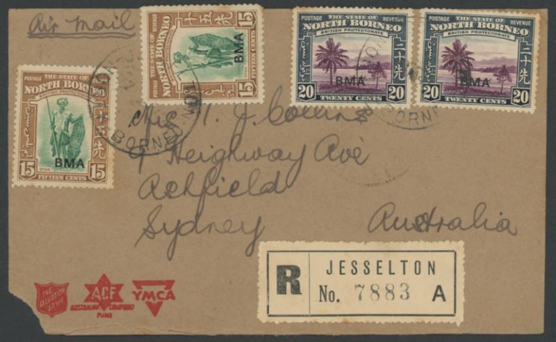 POSTAL HISTORY: 1947 (Jan 20) Salvation Army/ACF/YMCA red/buff envelope registered airmail to Sydney with "Capt TJ Collins, 8AWGU" [Australian War Graves Unit] return address and 'BMA' Overprints 15c Dyak x2 & 20c River x2 tied by Australian-pattern 'JESSELTON/NORTH-BORNEO' cds and large 'R/JESSELTON' black/cream label on the face, 'SINGAPORE/28 JA/1947' transit and Sydney '-3FE47' arrival backstamps, a few blemishes & small corner fault at lower left. [Over 2000 Australians died on Borneo during WWII, most of them while being held as captives of the Japanese at the notorious Sandakan POW Camp] (Image1)