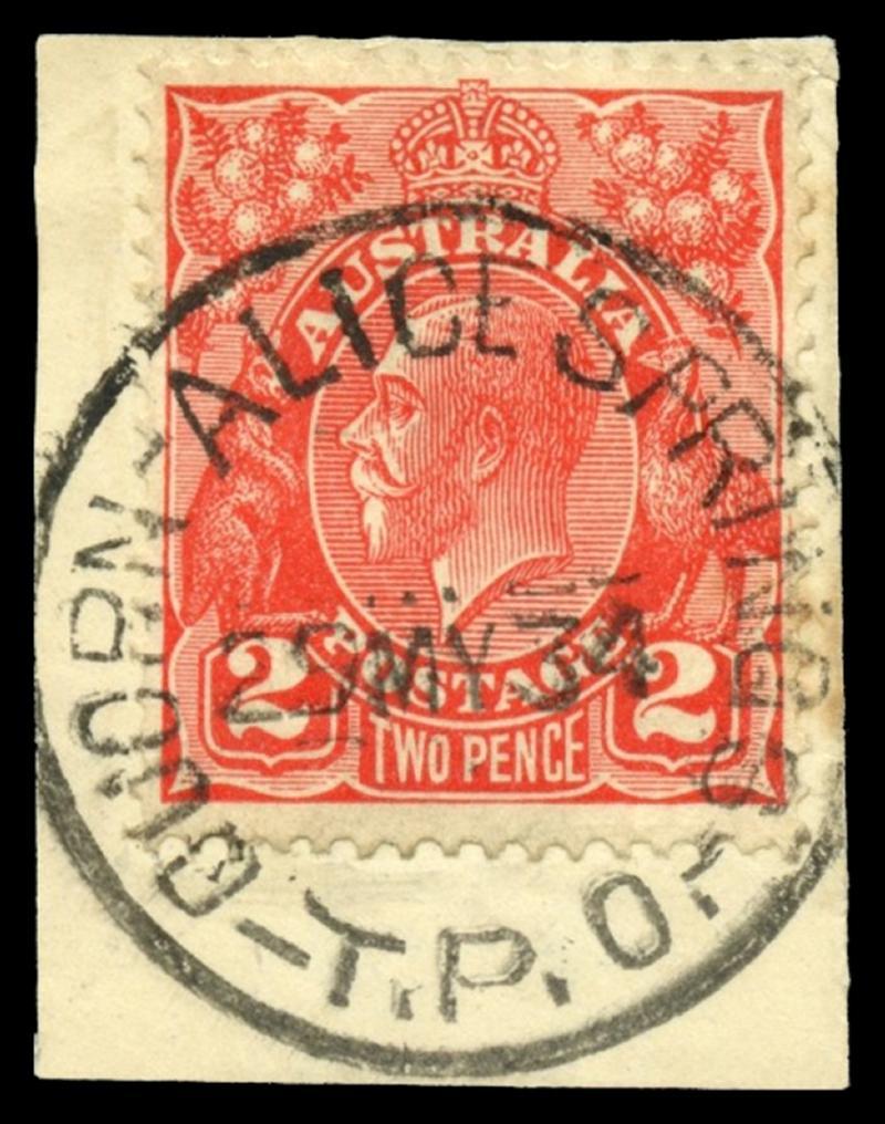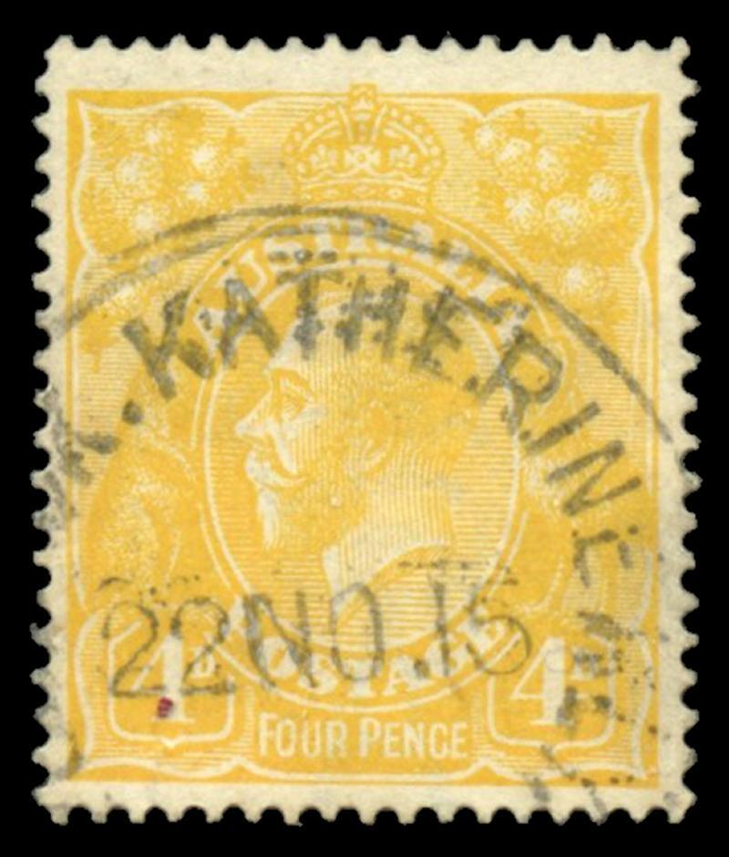 Pine Creek-Katherine Railway: '[....] CK.KATHERINE RLY/22NO15/[NT]' largely very fine strike on KGV 4d yellow-orange. Rated RRRRR: the only recorded example. PO 27.8.1915; closed 30.5.1917. [The very existence of this TPO was unknown until this item was discovered in 2007, when it was sold for $1350]