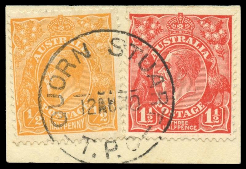 Quorn-Alice Springs TPO: 'QUORN STUART/12AU30/TPO' (after the change of name) superb strike on KGV ½d orange & 1½d red. Rated RRRRR: the only recorded example.