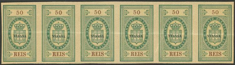 Strip of 6 of old 50Rs. revenue stamp of Mozambique overprinted NYASSA, MNH, with a horizontal crease else VF quality! (Image)