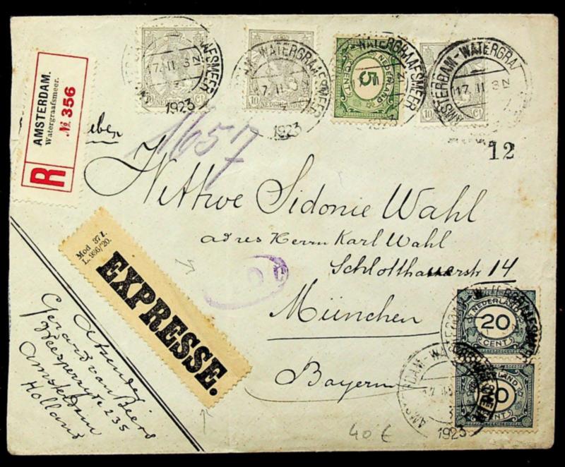 Netherlands 1923 6v on Regd Express cover from Amsterdam to Munich Germany w/ violet oval cachet (Image)