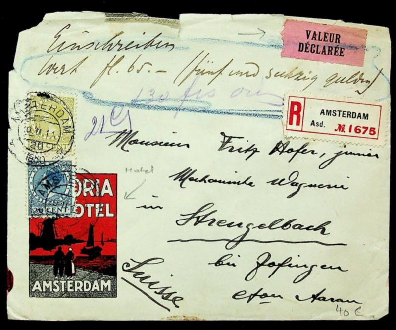 Netherlands 1930 Wilhelmina 2v on Regd cover from Amsterdam to Switzerland w/ Hotel & "VALEUR" labels (Image)