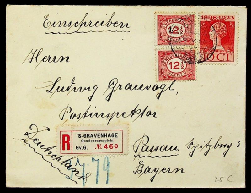 Netherlands 1924 Wilhelmina 10c+ 12½cx2 on Regd cover from s-Gravenhage to Passau Germany (Image)