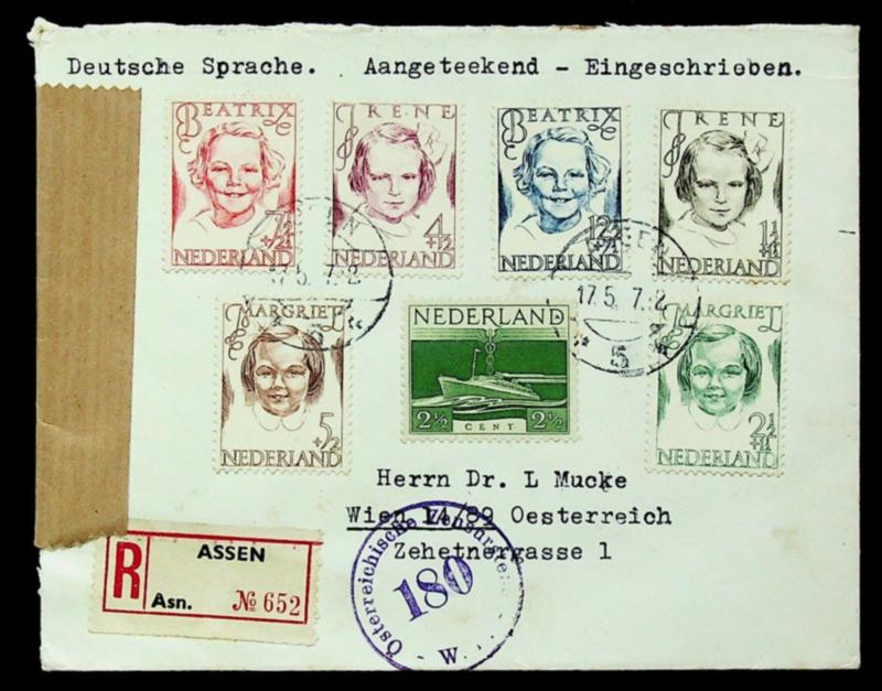 Netherlands 1947 Child welfare 7v on censored Regd cover from Assen to Wien Austria (Image)