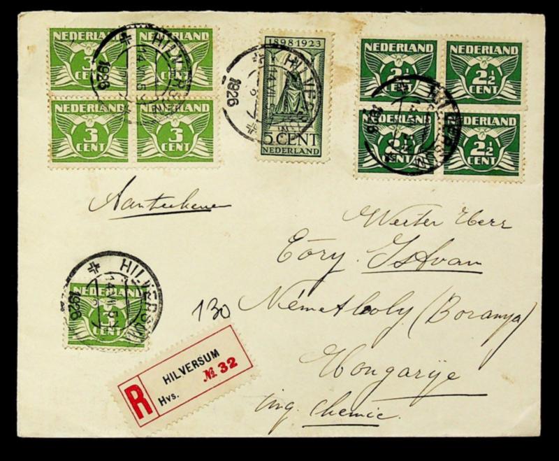 Netherlands 1926 2½c & 3c 2 blocks of 4+ 2v on Regd cover from Hilversum to Hungary (Image)