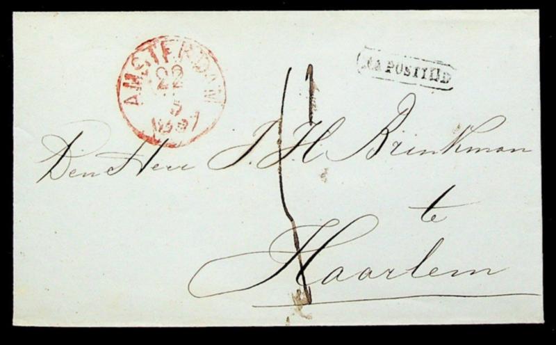 Netherlands 1857 stampless cover with charge markings & "NA POSTTIJD" cachet from Amsterdam to Haarlem (Image)