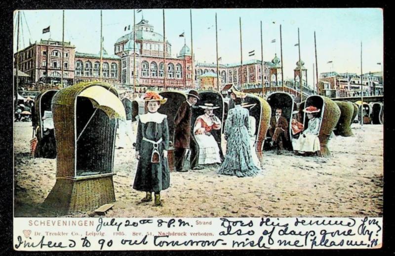 Netherlands 1905 Scheveningen Beach PPC w/ 5c & Arms cachet from s-Gravenhage to England w/ Hotel seal (Image)