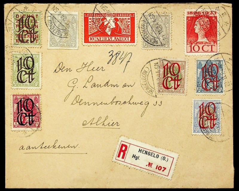 Netherlands 1924 Wilhelmina 6v w/ s/c+ 4v on Regd cover sent within Hengelo (Image)