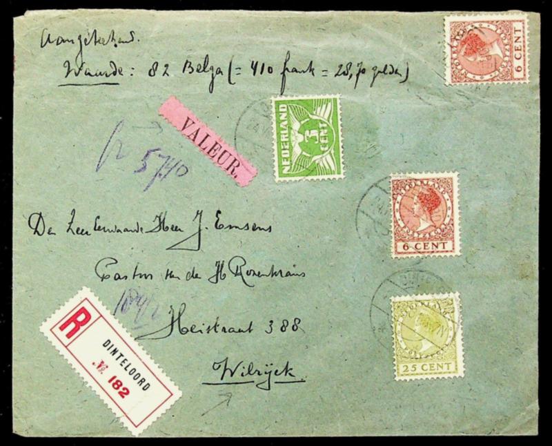 Netherlands Wilhelmina 4v on Regd cover from Dinteloord to Wilrijk Belgium w/ "VALEUR" label (Image)