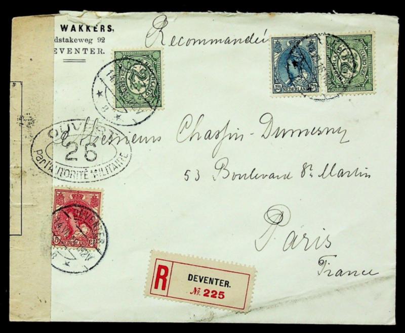Netherlands 1916 WWI Wilhelmina 4v on censored Regd cover from Deventer to Paris France (Image)