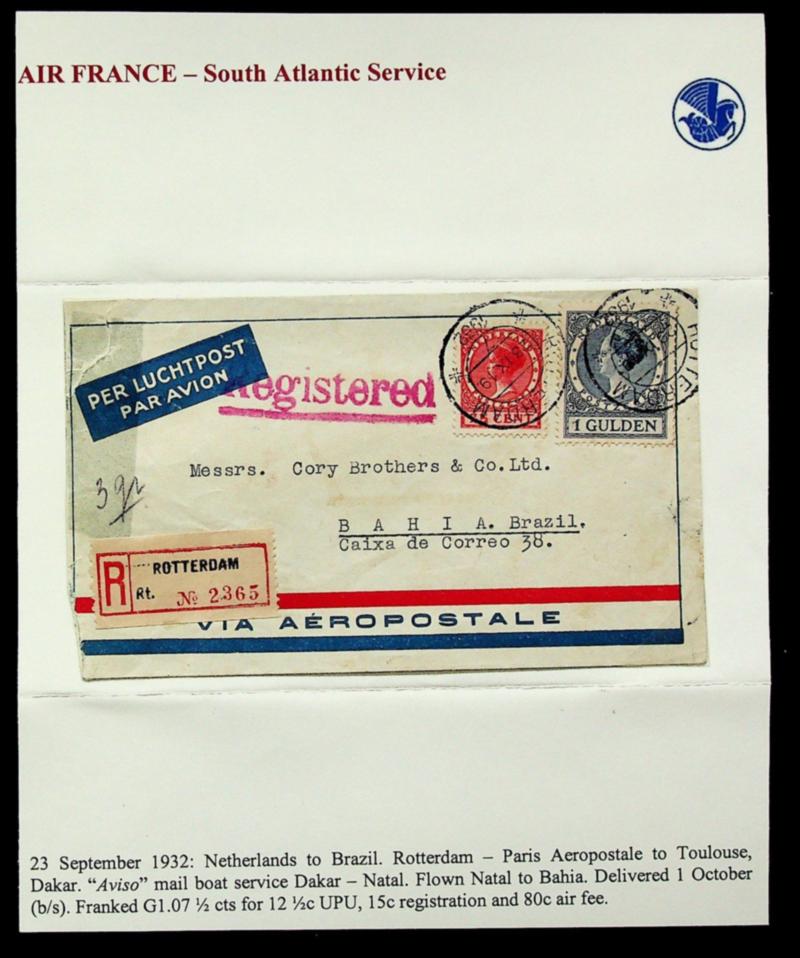 Netherlands 1932 2v on Air France-South Atlantic Service Regd airmail cover from Rotterdam to Bahia Brazil (Image)