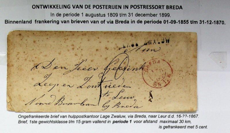 Netherlands 1867 stampless cover w/ charge markings from Lage Zwaluw via Breda to Leur (Image)