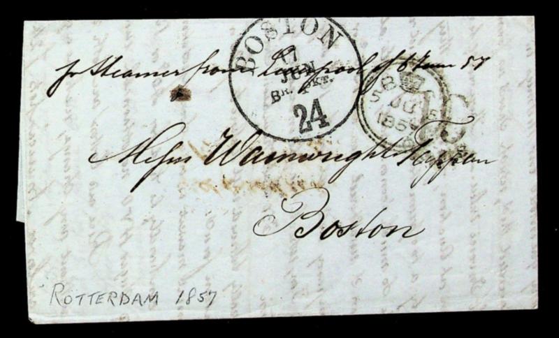 Netherlands Rotterdam 1857 stampless cover to Boston USA w/ "NT Scherrers London" Forwarding Agent's seal at back (Image)
