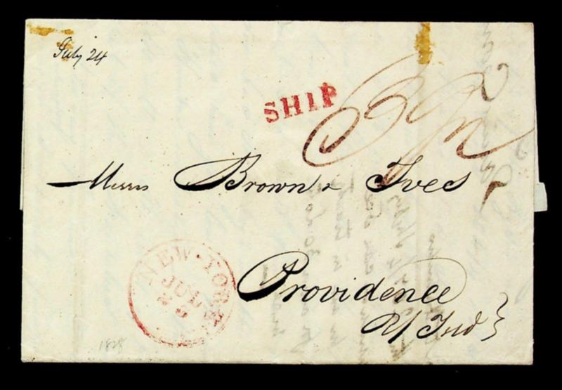 Netherlands Amsterdam 1828 prestamp cover w/ "SHIP" cachet in red via New York to Providence USA w/ "Hottinguer & Co Havre" Forwarding Agent's seal at back (Image)